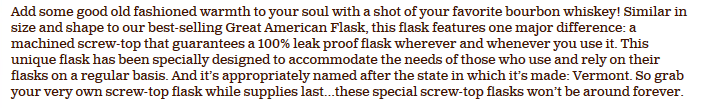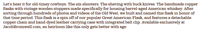 I like and do recommend these make with care by people of Jacob Bromwell. America's original and most beautiful and stylish flasks. Made in America by Americans. Cocoats buy chinese cheap flasks. You and me spend just some money and buy something to be proud always. Not for everyone. Drinking and enjoying at the same time, of course. Click below to any you like to go to Jacob Bromwell site for more information
